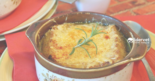 Pon a derretir la mantequilla en una cacerola y añádele las cebollas cortadas en medios aros. Cuando estén casi hechas añade la harina, la sal y la pimienta, mézclalo bien y échale el caldo. Deja cocer hasta que la cebolla esté tierna. Sírvelo muy caliente y pon una loncha de queso encima y el pan recién tostado.